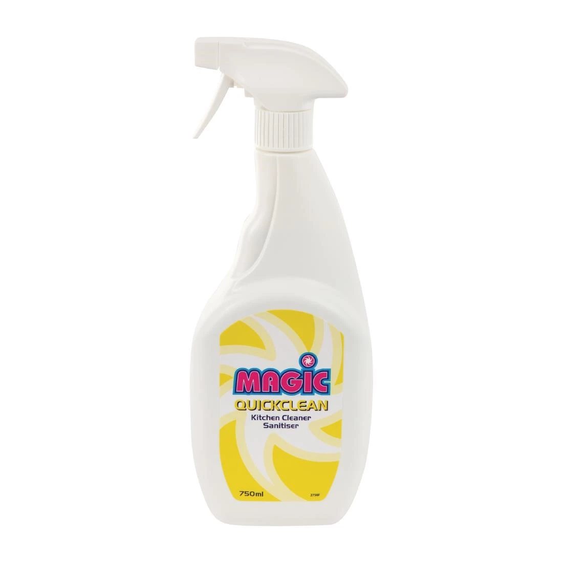 Maintain the highest hygiene standards in your kitchen by using this pack of 6 x 750ml Magic Quickclean cleaner and sanitiser ready-to-use bottles. Combining high-performance surfactants with bactericides, this solution will power through heavy soiling and eliminate a range of bacteria in 30 seconds. This makes it simple for staff to keep your surfaces, utensils and equipment spotless and hygienic.