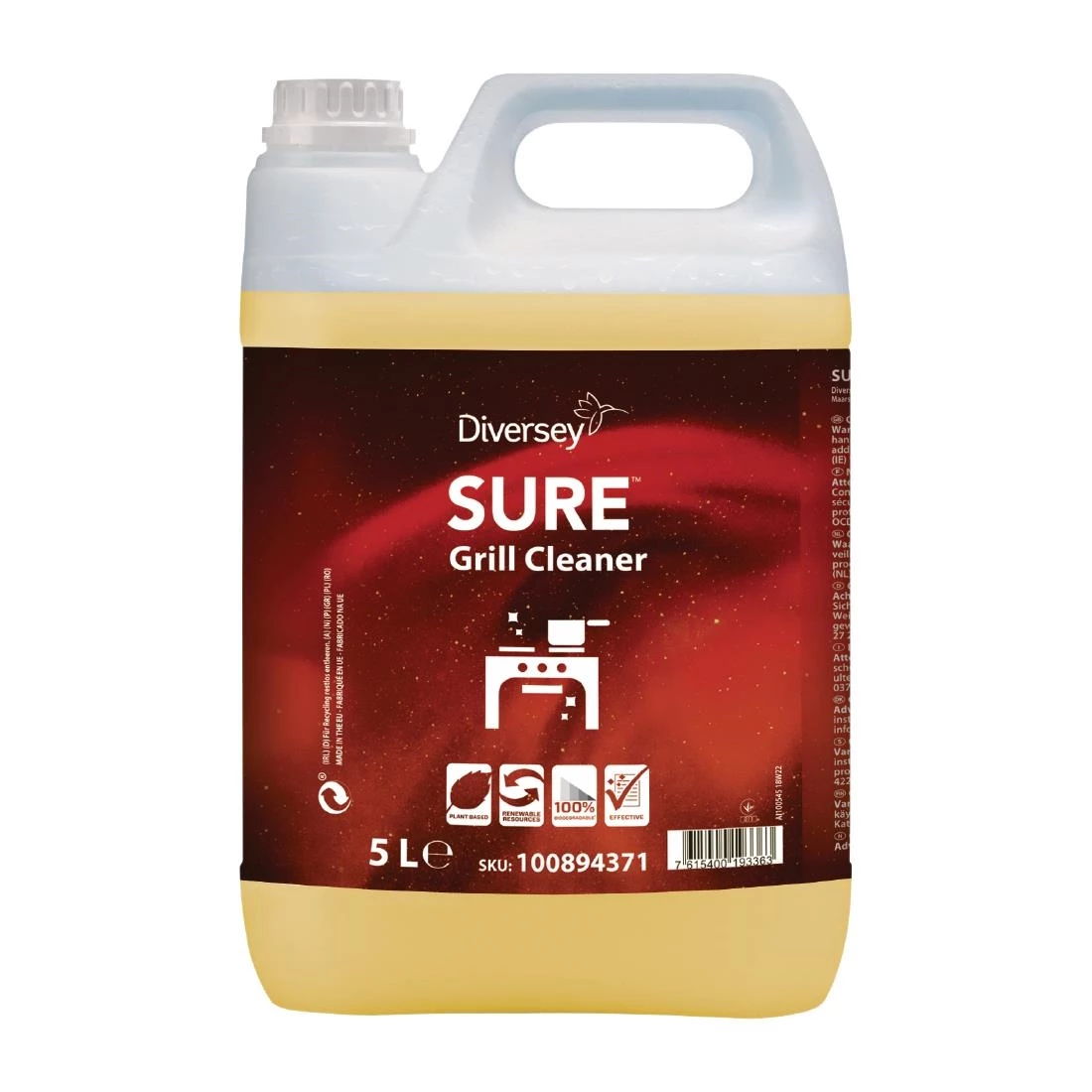 Guarantee effective, sustainable and safe cleaning with this 5Ltr Diversey SURE grill cleaner concentrate bottle. This grill cleaner is made entirely from renewable, plant-based materials, making it fully biodegradable and free from hazardous ingredients. This means it won’t damage the environment as it breaks down and will keep your staff protected against potentially harmful substances when cleaning.