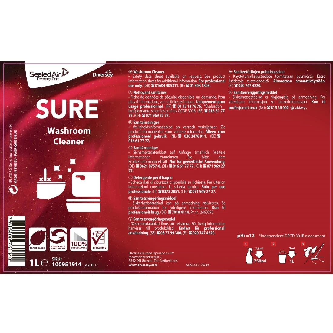 Keep your washrooms and the planet clean by switching to this 1Ltr Diversey SURE washroom cleaner concentrate bottle. With a formula made entirely from renewable, plant-based ingredients, this washroom cleaner is completely biodegradable and free from potentially hazardous substances. This means it will keep staff protected against potentially harmful substances when cleaning and won’t damage the environment as it breaks down.