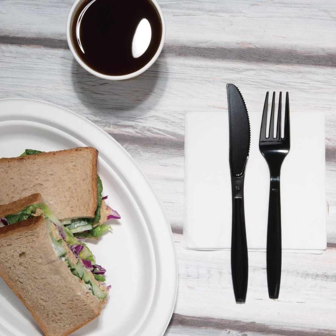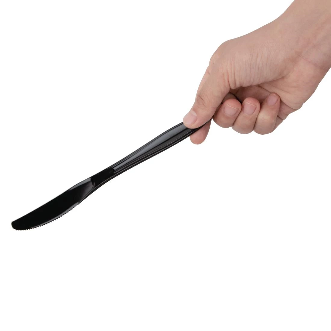 Up to the task of cutting through take way foods such a jacket potato skin, Panini or burgers, these disposable knives are an essential for any establishment offering carry out meals. Constructed from black polystyrene, these knives are among the toughest disposable knives available and are perfect for BBQ’s or any functions where it is not practical to wash up afterwards.