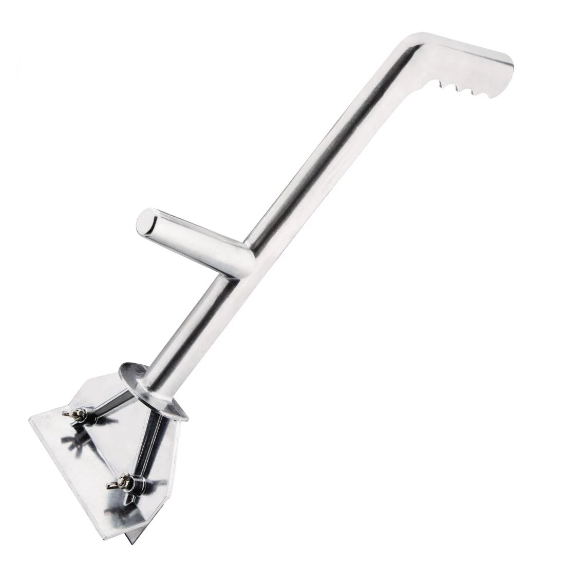 This stainless steel griddle scraper features a sturdy one-piece construction with hand support and easy to replace blade, ideal for removing burnt on foods and grease. Keeping your griddle clean and free from burnt grease and food is essential to maintaining superior cooking results. The practical hand supports make cleaning any griddle easy and comfortable.