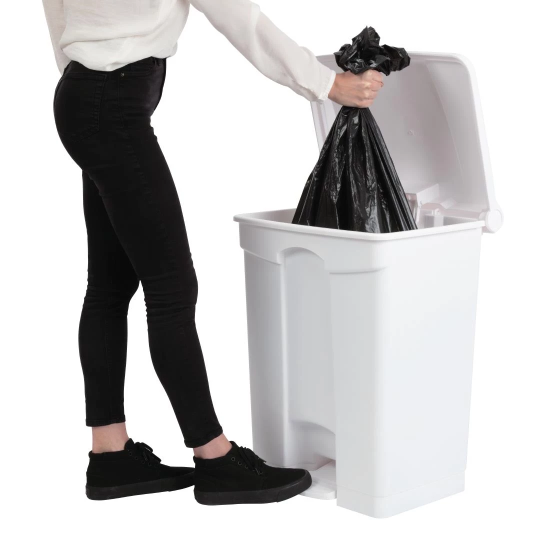This high capacity kitchen bin in clinical white benefits from a strong polypropylene construction and a hands-free pedal operation which helps to cut the risk of cross-contamination in kitchen areas. Built for heavy commercial use, the Jantex pedal bin also features hooks for bin bags, and a tight fitting lid which minimises odours, making it ideal for use in busy kitchens and a wide range of catering environments.