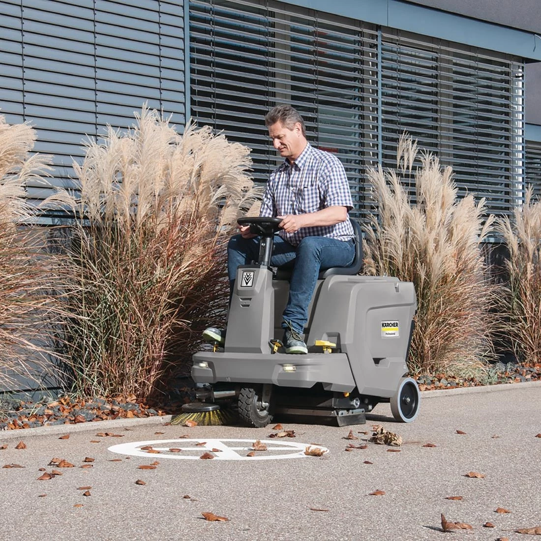 The Karcher KM 85/50 R Bp ride-on sweeper is a powerful, time-saving solution for cleaning large areas. Designed for performance and ease of use, the Karcher delivers impressive cleaning ability and functionality. The compact design and small turning circle allows the user to move the sweeper into confined areas, reducing the need for manual sweeping or mopping. Further convenience is added by the built-in battery powered motor ¿ as there’s no need for cables or wires to operate, the sweeper can move about freely without creating any trip hazards. Maintenance is easy too, with most components able to be changed by the user without specialist training.