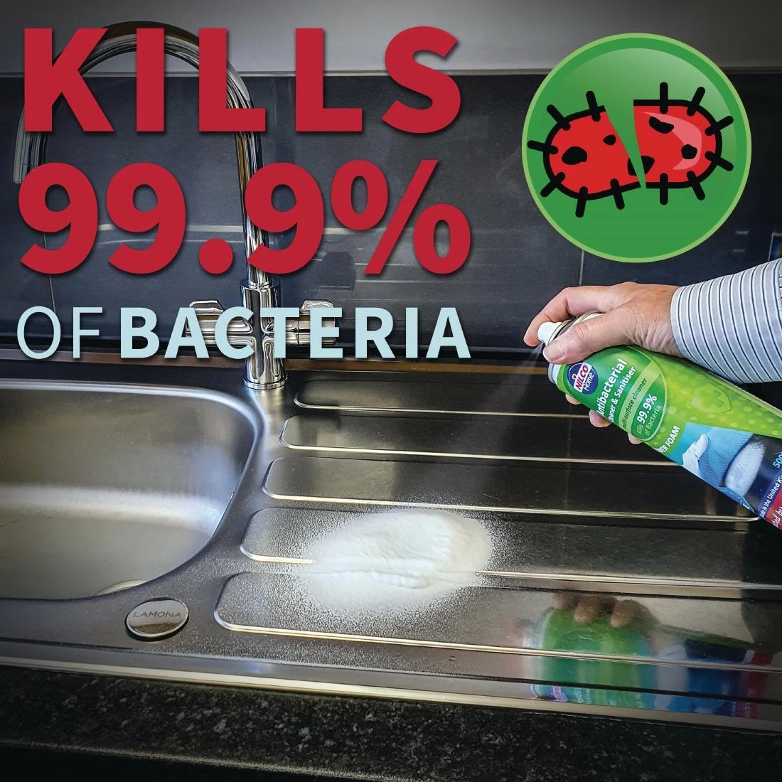 Ideal on hard surfaces, this antibacterial cleaner and sanitiser is a powerful foam cleaner for use in and around the home. The fast acting foaming action removes grease and grime with minimal effort whilst the antibacterial action kills 99.9% of household bacteria and moulds.