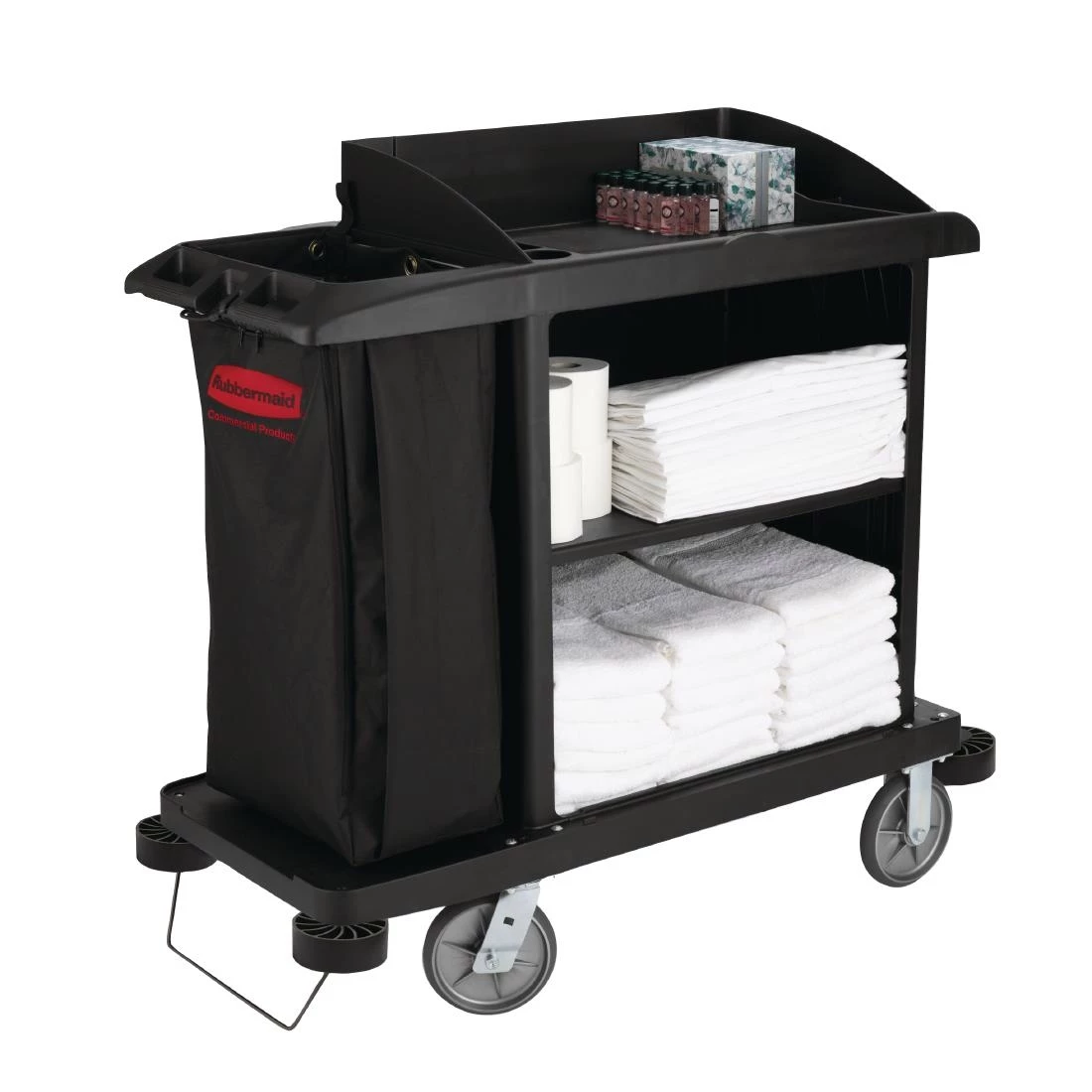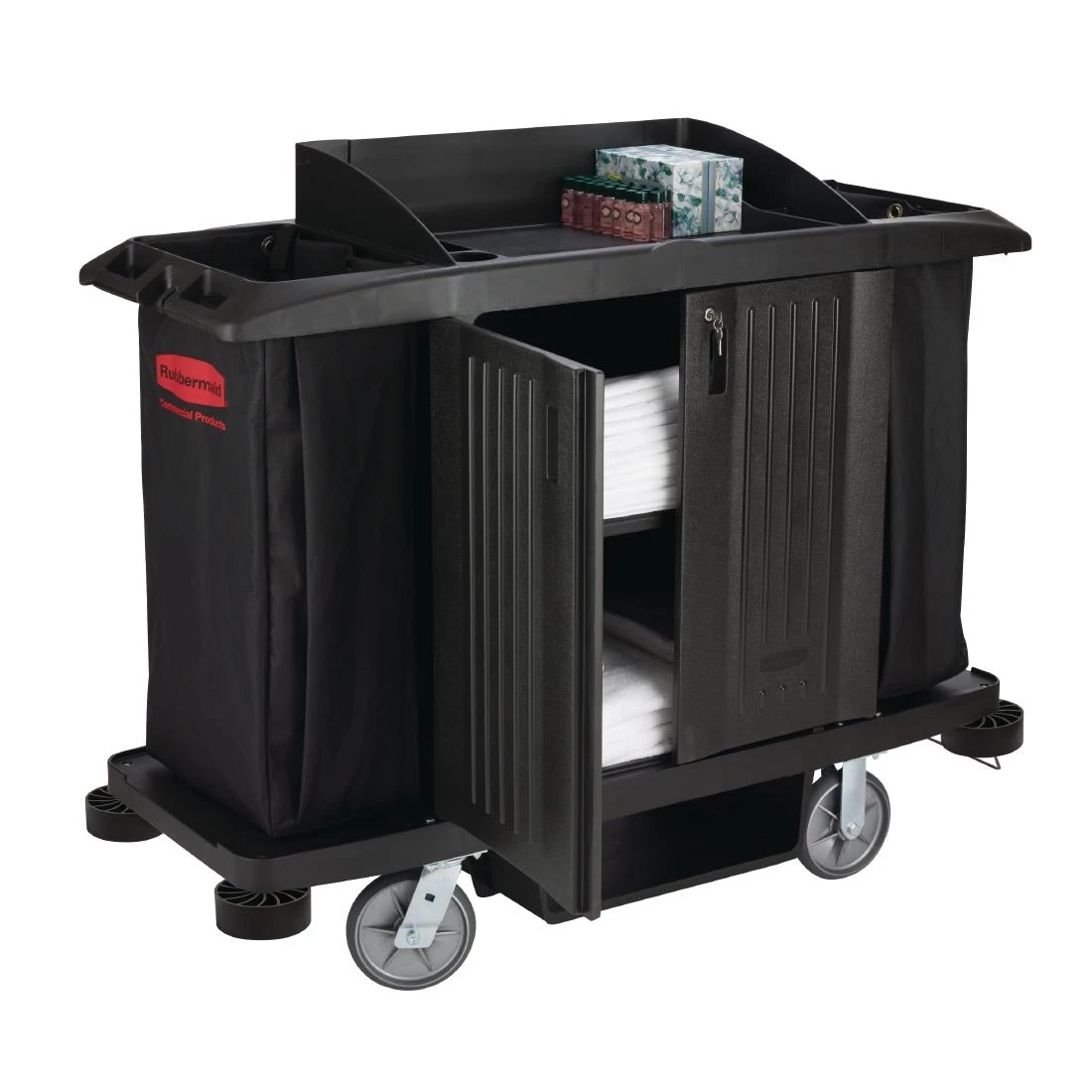 High capacity housekeeping cart, designed for larger hotels. Fully equipped the cart can service up to 16 rooms. The medium compact model requires less floor space, while lighter loaded weight helps prevent cart overloading and worker strain. The cart is light and versatile with an exceptional manoeuvrability; this helps to make the housekeeper more productive whilst helping to reduce strain and injuries. Adjustable shelf in cabinet accommodates specific storage needs and provides flexibility.