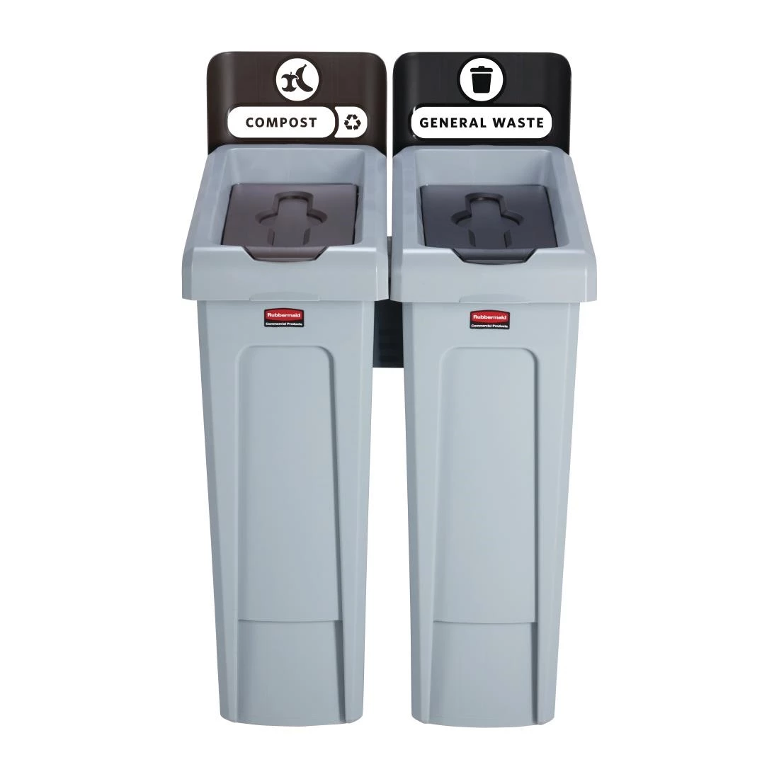 Improve the effectiveness of your recycling process with the 87Ltr Rubbermaid Slim Jim three stream recycling station. Featuring containers for general waste, compost and mixed recycling, this three stream station will help you reduce the amount of waste you send to landfill and divert more materials for recycling. As such, this recycling station works to decrease your business’s environmental impact, improve your sustainability and save you money on landfill costs. Colour-coded and labelled billboards, lid inserts and stickers also make each stream easily identifiable. This will help your staff and customers to correctly segregate their rubbish and prevent the contamination of each waste stream.