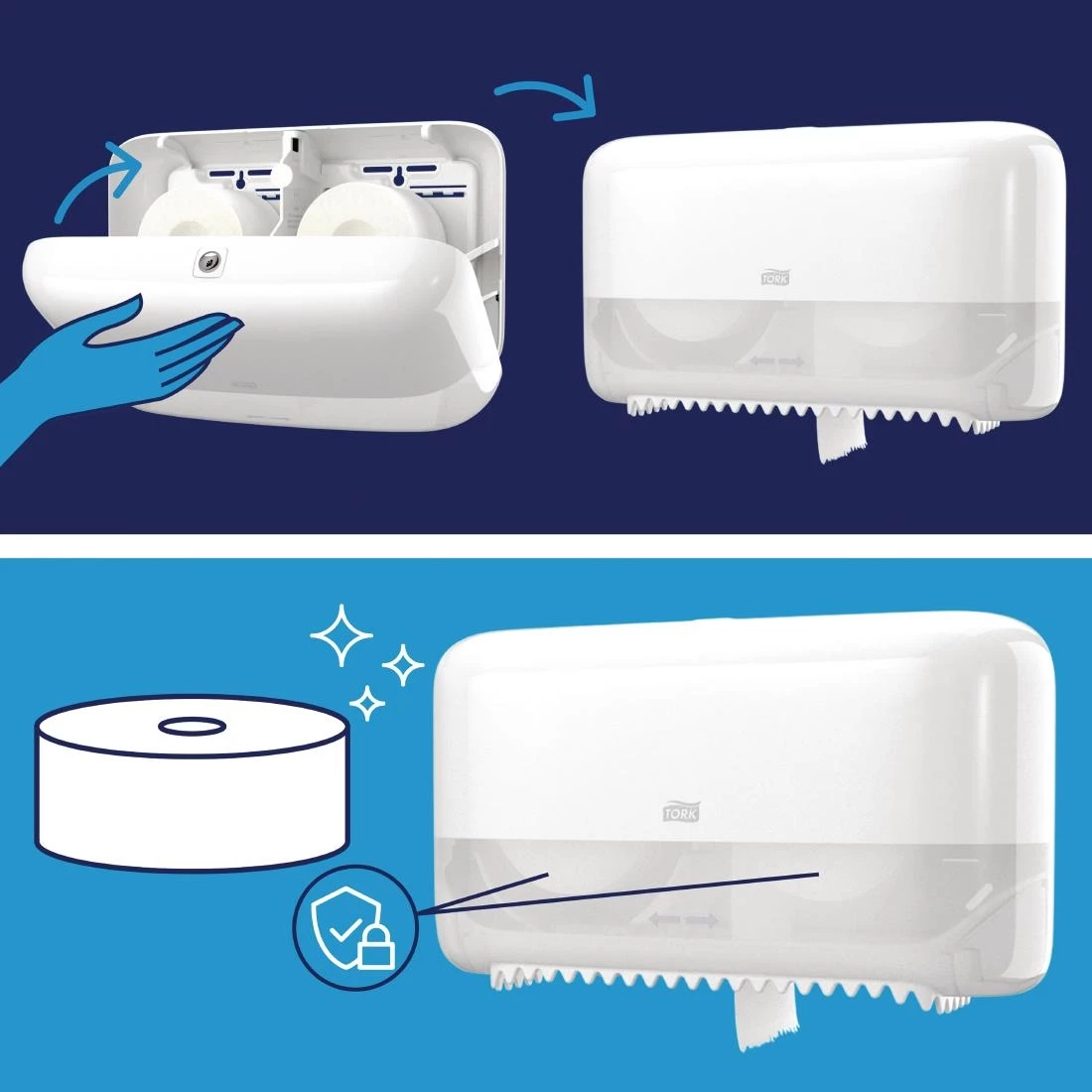 The Tork coreless toilet roll refill features approximately 900 high quality 2-ply sheets per roll, making them suitable for use in any commercial or public washroom or bathroom. These great value toilets rolls come in a pack of 36, ideal for busy washrooms such as in restaurants, cafes and bars.